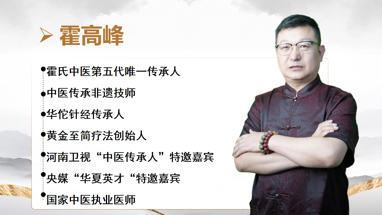 本课程由霍高峰老师亲授。霍老师作为霍氏中医第五代唯一传承人、中医传承非遗技师、华佗针经传承人及黄金至简疗法创始人,具备国家中医执业医师资质,并多次受邀担任河南卫视“中医传承人”及央媒“华夏英才”节目嘉宾。